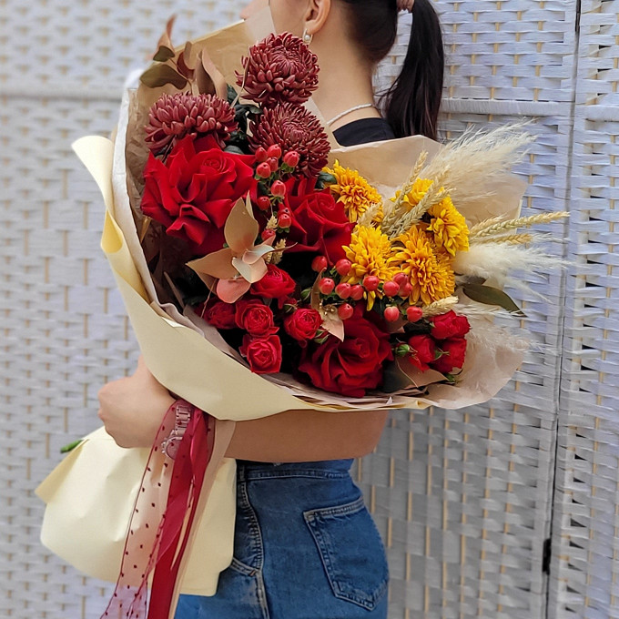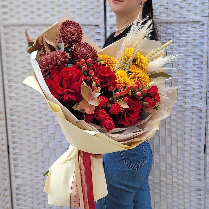 Роза эквадор (красный) 90 см — 3, роза кустовая — 2, хризантема одноголовая — 4, хризантема одноголовая — 3, гиперикум — 3, пшеница (тритикум) 1 колосок — 5, помпасная трава — 3, оформление — 2, лента атласная — 2, эвкалипт — 3